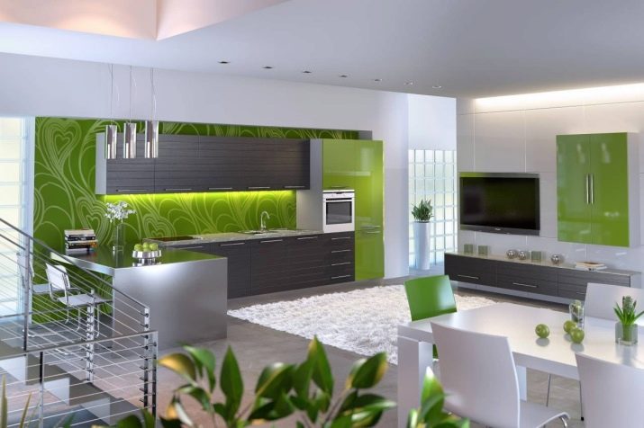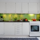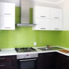 Бяла кухня със светло зелена престилка изглежда много стилно и модерно. Комбинацията от бели и лимонови цветове с лъскав блясък ще изглежда още по -сочна за декориране на работната зона. По -добре е да декорирате такива ярки повърхности със стъкло..
