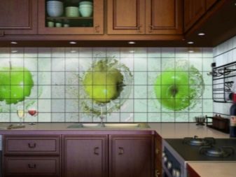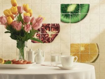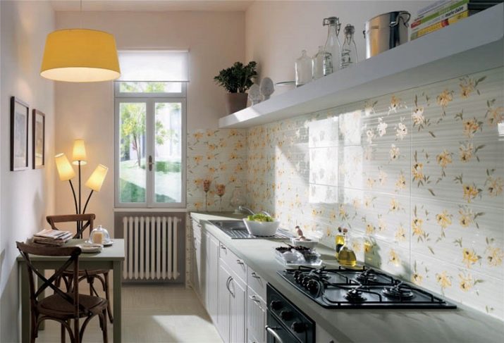На първо място, нека поговорим за плочките като по -практичен вариант за кухненски дизайн. Има много видове керамични плочки. Тя може да бъде едноцветна или украсена с разнообразни шарки и цветни покрития..