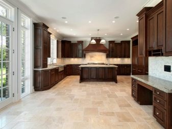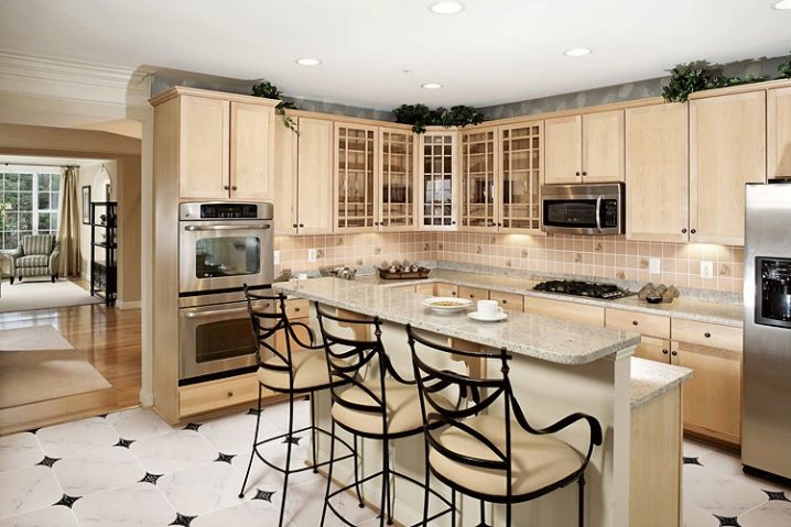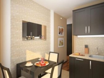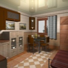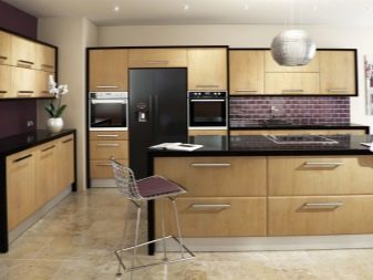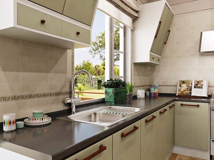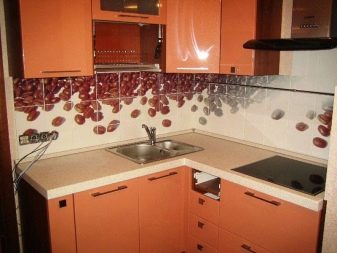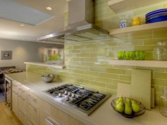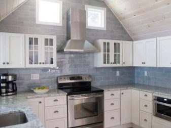 Достатъчно рядко плочки със специфични скосени ъгли се използват и за украса на кухненското пространство. Най -често тази опция за плочки се използва за декориране на пода, а не на стените. Такива плочки също не са много практични, така че трябва да дадете предпочитание на изключително висококачествени матови плочки..