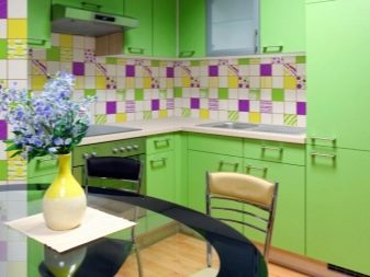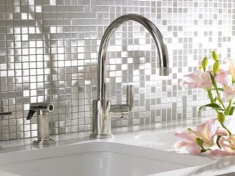 Малки мозаечни плочки също често се използват за декориране на кухни. Това ви позволява да създавате различни интересни картини, пейзажи или просто модели. Имитацията на мозайката е лоша, защото мръсотията се натрупва достатъчно бързо в ставите. Следователно стените, проектирани по този начин, трябва да отделят особено много време по време на процеса на почистване. Мозайка от керамични плочки далеч не е най -популярният вариант, тъй като същите шарки или картини могат да бъдат възпроизведени по стените на кухнята по други начини, например чрез инсталиране на престилка или чрез залепване на тапети.