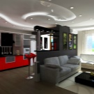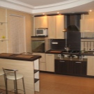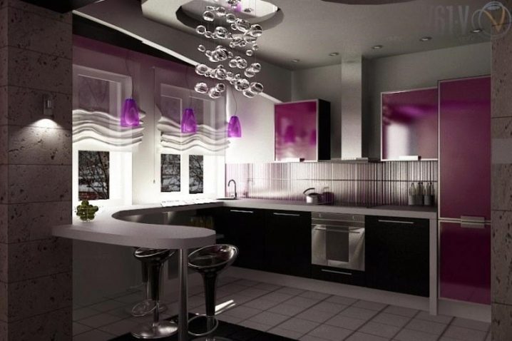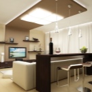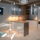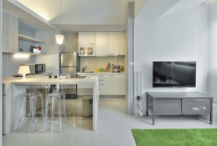 За малък апартамент, където комбинирана кухня-хол (известен още като спалня) ще бъде единствената стая, светлите цветове на мебелите са най-подходящи. Бар плотът в непосредствена близост до работната повърхност и служи като маса за хранене. В същото време дъното й е покрито със стъкло, а столовете са изцяло от прозрачна пластмаса. Така че дизайнерите не позволиха затрупване и визуално разшириха пространството..