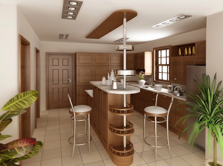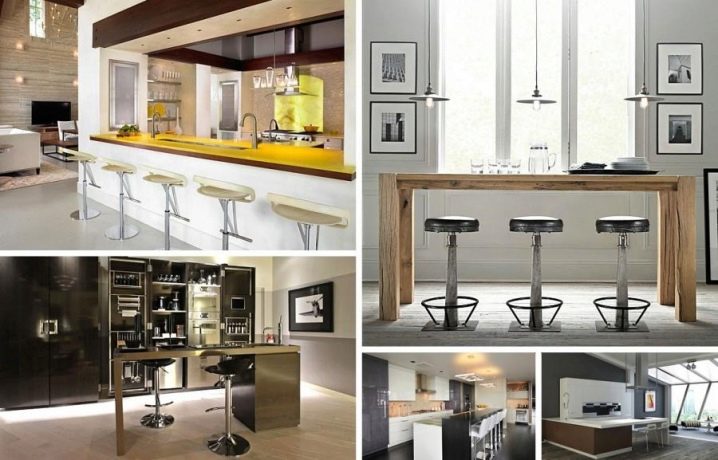 Подобно на масата в кухнята, бар плотът може да бъде „остров“ или „полуостров“. Островен дизайн – за голямо студио. Въпреки че бар плотът е тесен сам по себе си, така че да е удобно да се доближава до него от всички страни, разстоянието до кухненския комплект трябва да бъде най -малко 1,5 метра.