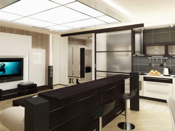Ако не сте готови за напълно отворено пространство, можете да обмислите опцията за екранна врата, която да се сгъва на гънки и да се разгъва, когато е необходимо. В този случай бар плотът ще бъде разположен вътре в кухненския бокс..