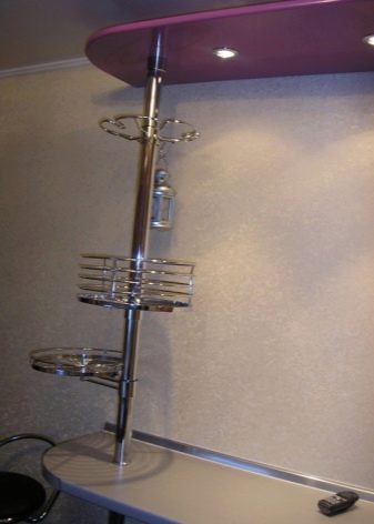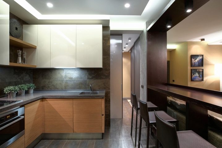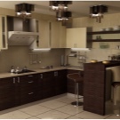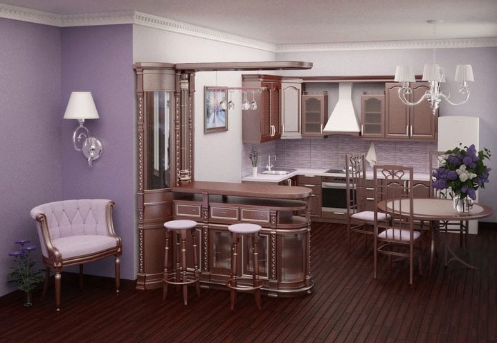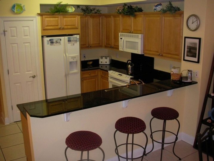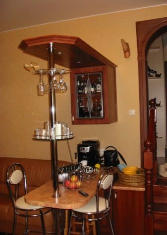 В малките апартаменти е популярен първият вариант, когато малка ъглова кухня се допълва от малък бар брояч върху тръбна опора. Отгоре планът на кухнята прилича на незавършена буква “P”. Най -често такъв багажник има декоративна функция. Той обаче може да побере малък бар с напитки и чаши, чинии, вази.