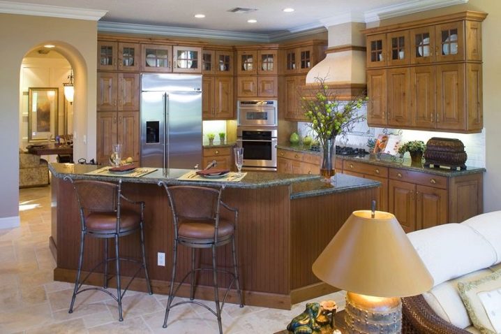 Комплект мебели за кухнята най -често трябва да се изработва по поръчка. В този случай експертите ще ви помогнат да направите правилно всички измервания и да разпределите място. Можете да изберете бар брояч за съществуваща слушалка. Можете да закупите готов комплект шкафове с островен или полуостровен бар брояч.