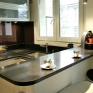 Дизайнерското решение е двуцветна кухня. Броячът отразява цвета и текстурата на материала с кухненската “престилка”.