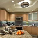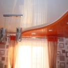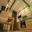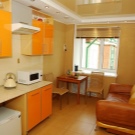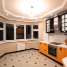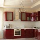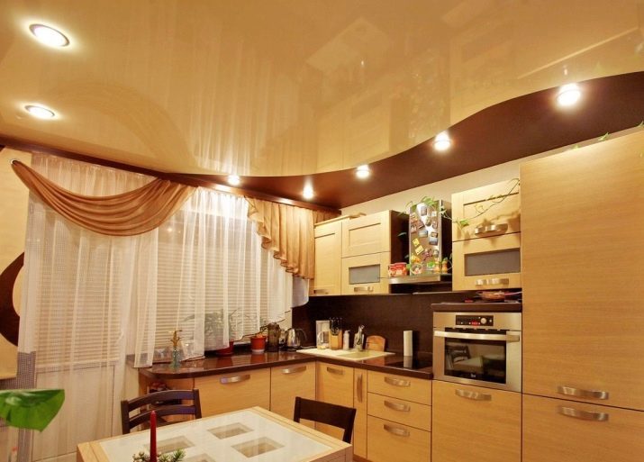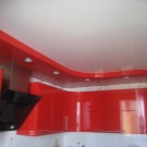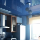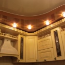 Също така, от характеристиките на тавани от гипсокартон, трябва да се отбележи, че тяхното инсталиране намалява височината на помещението със 7-10 см. Ако таванът е двустепенен, височината на кухнята може да бъде намалена до 25 см. Следователно, струва си да се обмисли, преди да се изпълнят в малки кухни с тавани 250 см. Частично компенсиране намаляването на височината на помещението може да бъде поредица от прожектори, вградени в тавана. Светлината от тях ще създаде илюзията за допълнителен обем; Недостатъкът на опънатите тавани е тяхната чувствителност към остри предмети. Дори и малка пункция е достатъчна, за да повреди тавана. И по аналогия с конструкциите от гипсокартон, такива тавани ще отнемат около 10 см от височината на помещението;