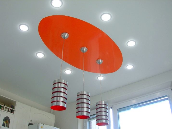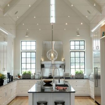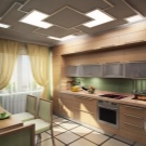 Също така, от характеристиките на тавани от гипсокартон, трябва да се отбележи, че тяхното инсталиране намалява височината на помещението със 7-10 см. Ако таванът е двустепенен, височината на кухнята може да бъде намалена до 25 см. Следователно, струва си да се обмисли, преди да се изпълнят в малки кухни с тавани 250 см. Частично компенсиране намаляването на височината на помещението може да бъде поредица от прожектори, вградени в тавана. Светлината от тях ще създаде илюзията за допълнителен обем;
