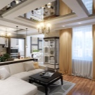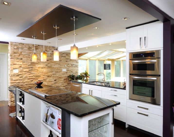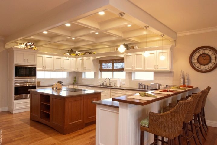 Съвременните дизайнери винаги обръщат специално внимание на таваните в стаята, защото това не е просто повърхност с полилей или лампа. Изборът на цвят, материал, текстура на тавана, неговото ниво, дизайн на осветление са само някои от точките, които трябва да се имат предвид при проектирането на тавана. Като се вземе предвид времето, което съвременният жител прекарва в кухнята, таванът не трябва да се уморява, да оказва натиск върху собствениците на апартамента и техните гости, осветлението на тавана трябва да осигурява еднаква приятна светлина и хармонично да допълва дизайна на стаята. Това се отнася особено за комбинирана кухня с трапезария или хол, когато комфортът и приятните емоции от това да сте в стаята са особено важни.