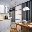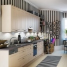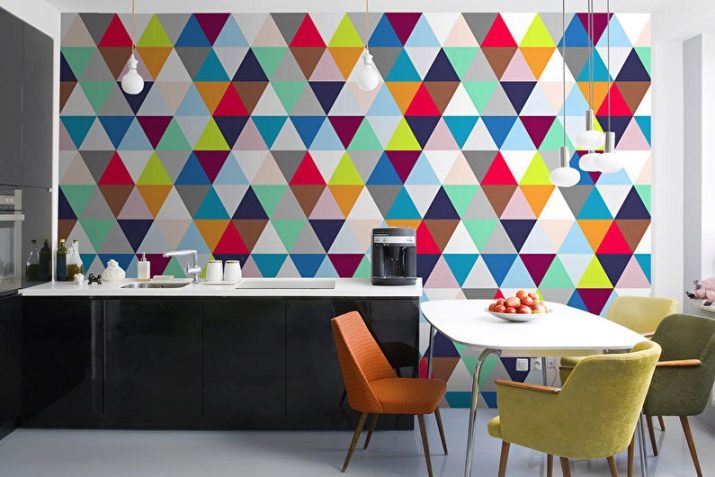 Работната зона може да бъде разнообразна с тапети в геометричен стил: ивици, клетки, кръгове, а в зоната за хранене – залепете фототапет с цветя или оригинален орнамент, който би бил комбиниран с общата концепция на кухнята.