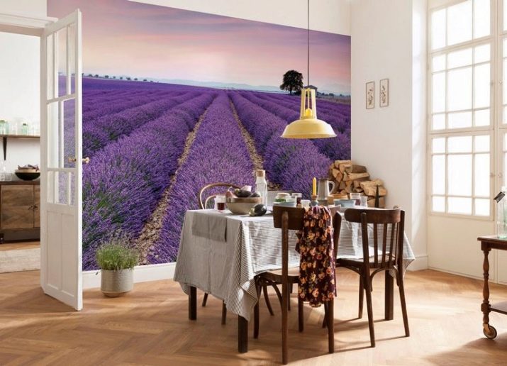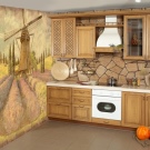 Фото тапет в стил “Прованс” – това са флорални шарки и изображението на безкрайни лавандулови полета, мелници и други декорации на френско село. Интериорът на кухнята в стила на “Прованс” изглежда особено привлекателен на голяма площ и ви позволява да вземете масивни мебели от естествено дърво, да украсите пространството не само с оригинални фототапети, но и с допълнителни рафтове и голям количество текстил.