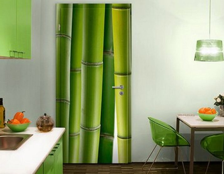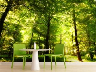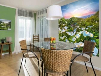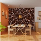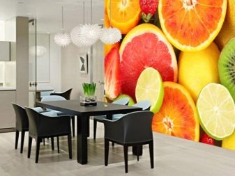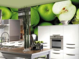 Тапетите с изображение на бамбук или камък ще изглеждат еднакво лаконично на стената, където се намира работната зона, и на тази, която има маса за хранене или удобен диван с кресла. В работната зона можете да поставите фототапет във формат на кафене: с изображението на процеса на готвене, снимки с храна, плодове, кафе и други рисунки, които по някакъв начин са свързани с готвенето.