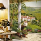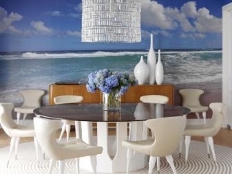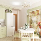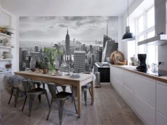 За просторна класическа кухня или “селски” формат изберете стенописи със селски или градски пейзаж, натюрморти или други естествени естествени изображения: флора, вода. Опитайте се да създадете уютно и вътрешно пространство в един нюанс, можете да играете с интензивността на цвета или неговата дълбочина; добре е фототапетът да се превърне в основен акцент на вашата кухня и да подчертае оригиналността на мебелите и подреждането им.
