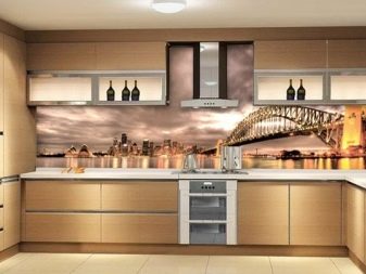 Като престилка е практично да се използват фототапети с изображение на нощен град, фреска, камък, плочки или дърво, натюрморт, което ще създаде оригинална работна зона; не забравяйте да защитите тапета с допълнително стъклено или пластмасово покритие – това ще предпази повърхността от мазнини, вода и различни петна.