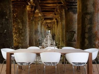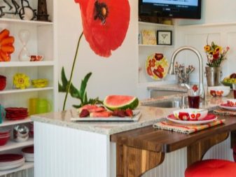 Фототапетът в интериора на кухнята е един от начините за разнообразяване на дизайна и зониране на голямо кухненско пространство в работна зона и зона за отдих. Ако погледнете традиционните съветски кухни, тогава в повечето от тях можете да намерите същите фотоапарати с иглолистна гора и безкрайни степи, изглежда, как са свързани с кухнята? Не забравяйте, че по това време изборът на тапети не беше толкова огромен и фототапетите изобщо се смятаха за предмет на интериорен лукс. Остава да не повтаряме грешките от миналото и да избираме оригинални модели и лаконични в тяхното изпълнение, такива, които идеално биха подхождали на определена кухня.