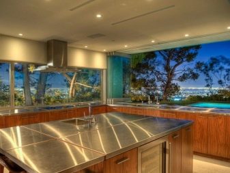 В голяма кухня изборът на фототапет е неограничен: можете да използвате само една стена или перпендикулярни стени, понякога огледален образ на картината изглежда като оригинално решение.