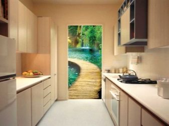 В тясна кухня тапетът с хоризонтален пейзаж изглежда лаконичен – разтегнат плаж или друг естествен обект, важно е чертежът да има хоризонтални линии.