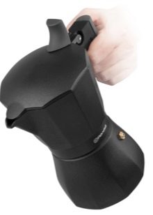 - Дръжката е с ергономична форма. Не е от пластмаса, а от найлон. Оборудван със силиконово покритие с мек допир. Благодарение на това дръжката не се нагрява, позволява ви да държите тенджерата за кафе дори в мокра ръка и не използвайте ръкавица за фурна.
