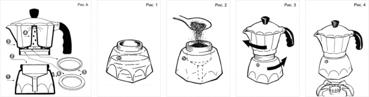 Приготвянето на кафе е бързо и лесно. Машината работи като гейзер. Наливате вода в долното отделение, отгоре се поставя филтър със специална фуния, в която се изсипват зърната. След това устройството се поставя на котлона и процесът на готвене започва. Парата се появява, когато заври. В горното отделение на кафе машината се приготвя напитка, в резултат на което се получава силно, вкусно и ароматно кафе..