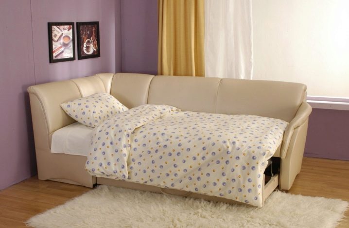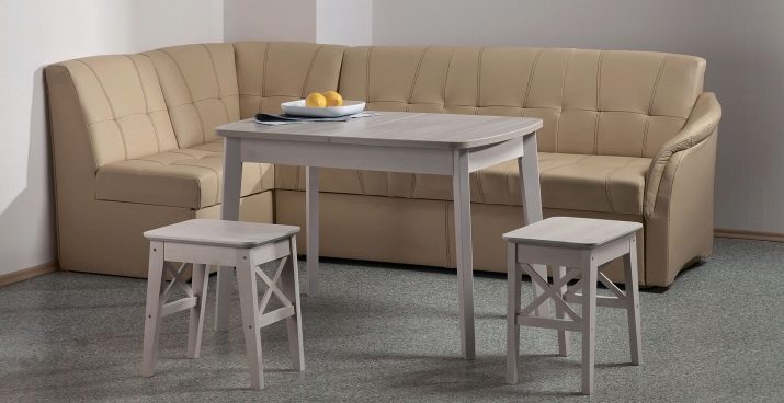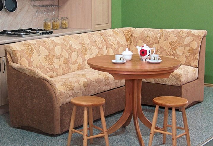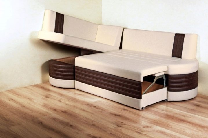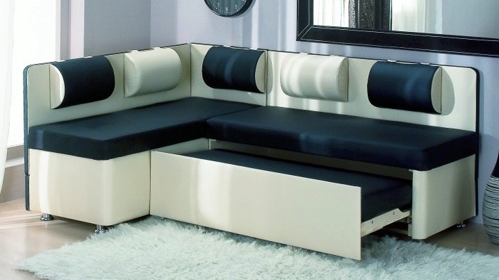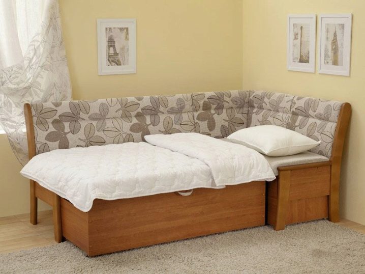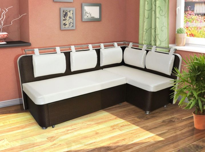Ако говорим за недостатъците на описания дизайн, те включват малката ширина на седалката (от 40 до 60 см). Ясно е, че ъгълът има такива размери, за да спести кухненското пространство, но ако става въпрос за разтегателен диван, тогава ширината на леглото трябва да бъде най -малко 70 см. В този случай производителите намират изход, като правят сгъваема конструкция, така че в резултат на това все още се постига необходимата ширина.