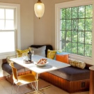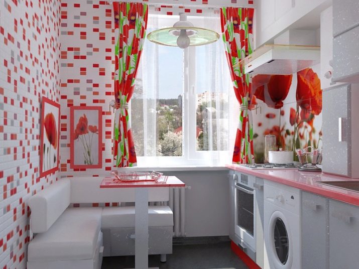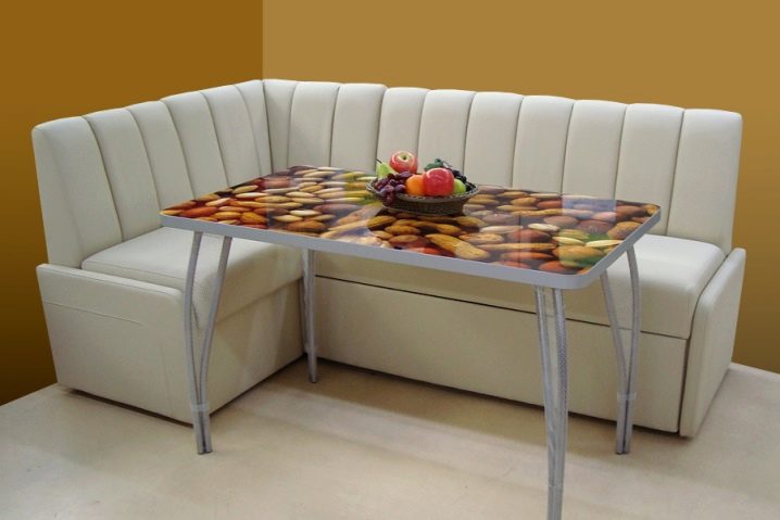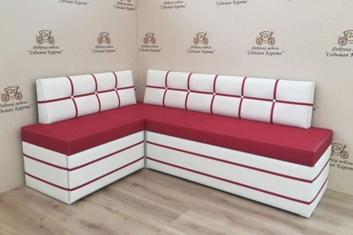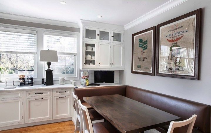 Това е както слънцето, което, гледайки през прозореца, осветява удобно масата, така и гледката, която се отваря от прозореца и радва окото. Освен това, заемайки ъгъл на кухнята, тази мебел значително спестява кухненско пространство. Най -добрият ефект може да се постигне, ако цветът на дивана е в контраст с цвета на стената..