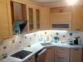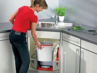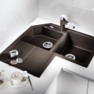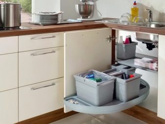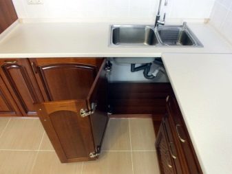 При планирането на кухнята трябва да се обърне специално внимание на местоположението на мивката.. Този атрибут обикновено заема много място. Можете да решите този проблем, като инсталирате ъглов шкаф под кухненската мивка. Този елемент на слушалките идеално ще се впише както в просторна, така и в малка стая..
