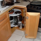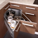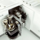 - Скосени ъгли. Тези видове продукти са под формата на трапец или триъгълник. Те се вписват перфектно във всеки интериор. Недостатъкът на такива системи е трудният достъп до отдалечени ъгли. Следователно, за да разрешите този проблем, трябва правилно да поставите елементи в контейнера. Много части, пълни с такива пиедестали, са специални въртележки, които правят удобно пълненето на контейнера.