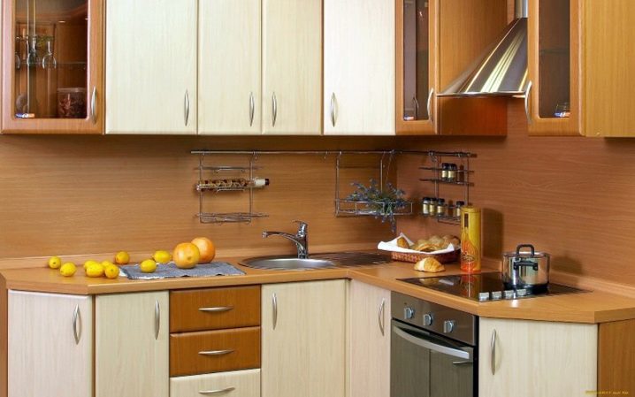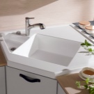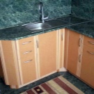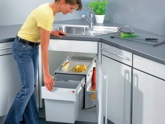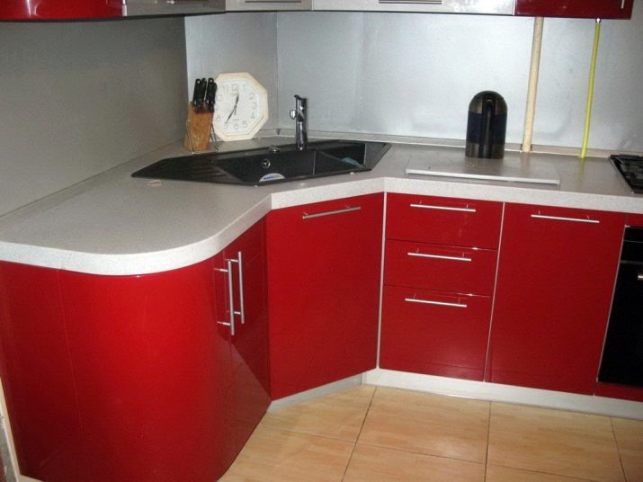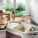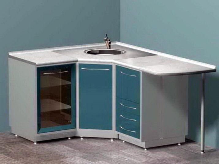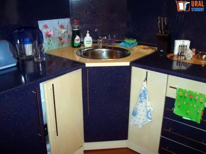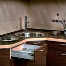 При планирането на кухнята трябва да се обърне специално внимание на местоположението на мивката.. Този атрибут обикновено заема много място. Можете да решите този проблем, като инсталирате ъглов шкаф под кухненската мивка. Този елемент на слушалките идеално ще се впише както в просторна, така и в малка стая..