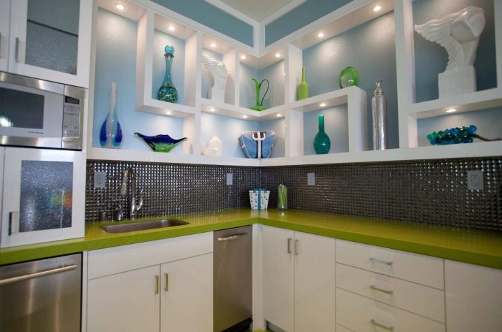 В днешно време напълно отворени ъглови кухненски шкафове са много популярни, които на външен вид наподобяват рафтове. В допълнение към основната си роля – съхранение на кухненски прибори, такъв модел шкаф може да се използва и за украса на вашата кухня. На такива рафтове можете да поставите красиви дизайнерски ястия, вази и други интересни и необичайни предмети, които привличат вниманието. Освен това можете дори да инсталирате малък телевизор, както и грамофон или радиоприемник на рафта на кухненски шкаф с отворен ъгъл..