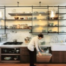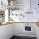 В днешно време напълно отворени ъглови кухненски шкафове са много популярни, които на външен вид наподобяват рафтове. В допълнение към основната си роля – съхранение на кухненски прибори, такъв модел шкаф може да се използва и за украса на вашата кухня. На такива рафтове можете да поставите красиви дизайнерски ястия, вази и други интересни и необичайни предмети, които привличат вниманието. Освен това можете дори да инсталирате малък телевизор, както и грамофон или радиоприемник на рафта на кухненски шкаф с отворен ъгъл..