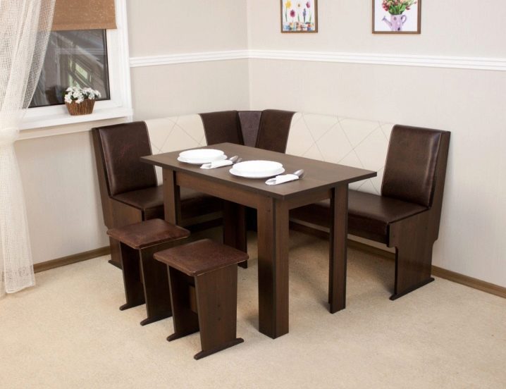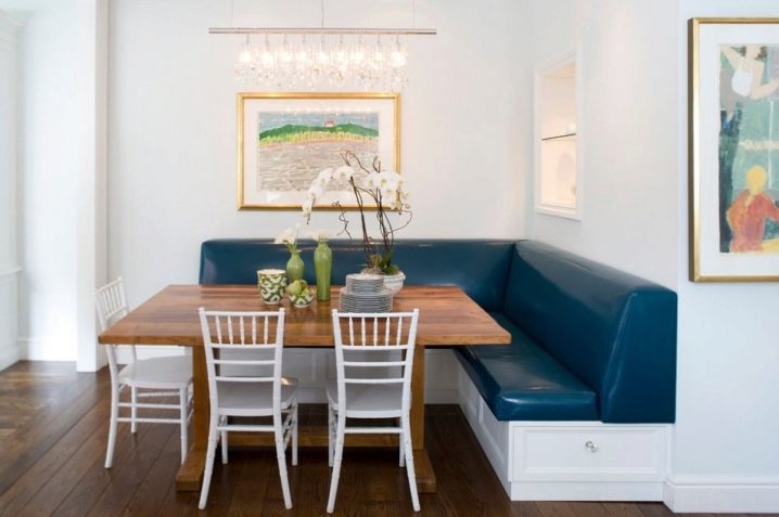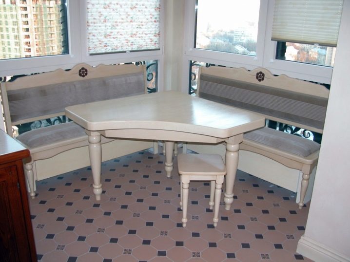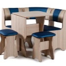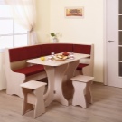 - Ъгловата маса за хранене е инсталирана в ъгъла. Такава инсталация спестява много добре място. Недостатъкът е малкият капацитет – 1-2 души.