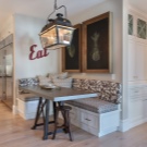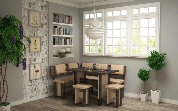 - Ъгловата зона за хранене е отлична възможност за простор – до 8 души, тъй като масата не е поставена до стената. Състои се от диван, маса и столове. За да се увеличи функционалността, диванът може да бъде направен с легло.