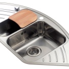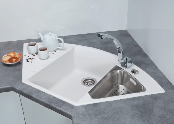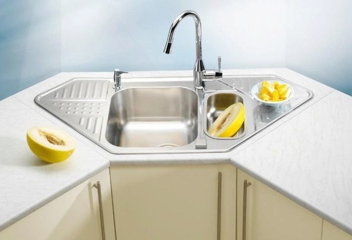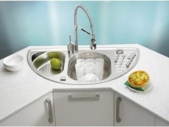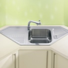 - Ъгловите мивки са еднакво добри за големи стаи и малки кухни. В първия случай той съкращава разстоянието от него до плочата. Във втория случай тя ви позволява рационално да използвате площта на кухненската стая.