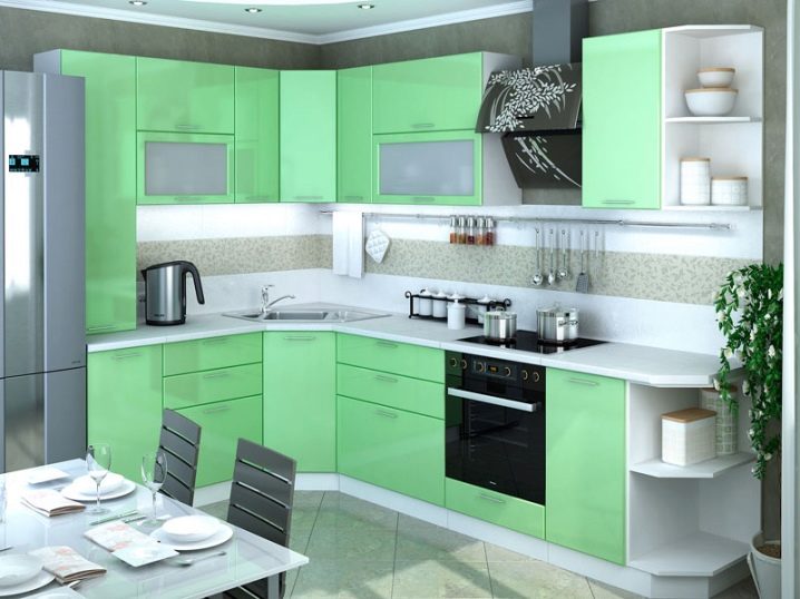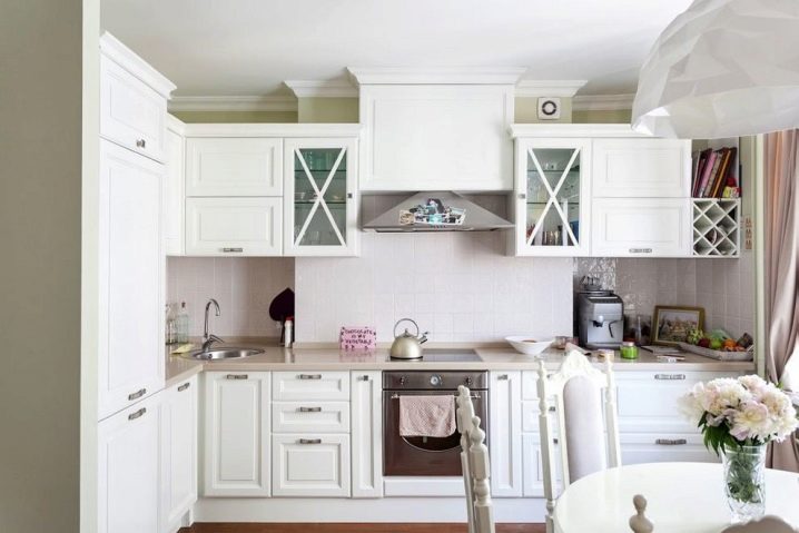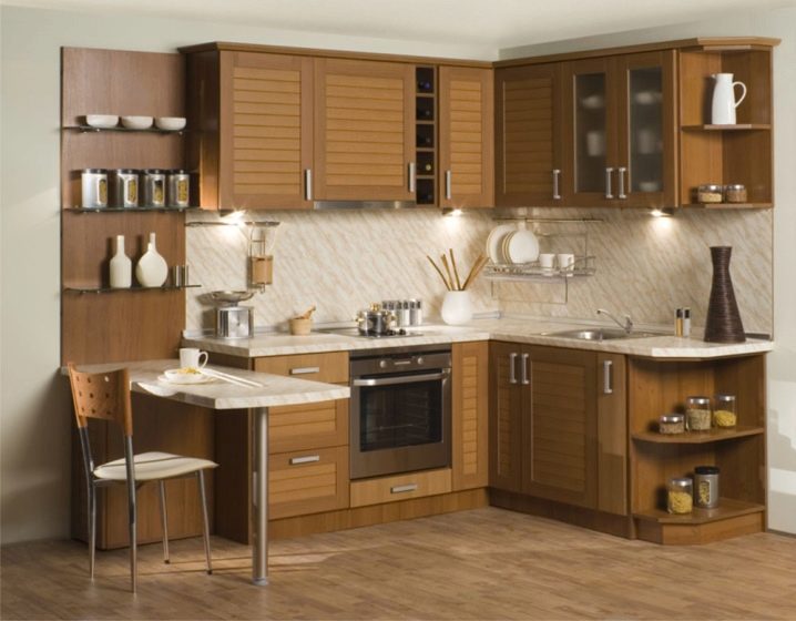 Но в същото време визуално тези мебели изяждат място. За да се изглади този ефект, е необходимо да се избере оптималната комбинация от цветове и довършителни материали. Например, използвайте леки и едноцветни керамични плочки за облицоване на стените на стая или престилка. Отразявайки осветлението, този довършителен материал ще направи кухнята по -просторна..