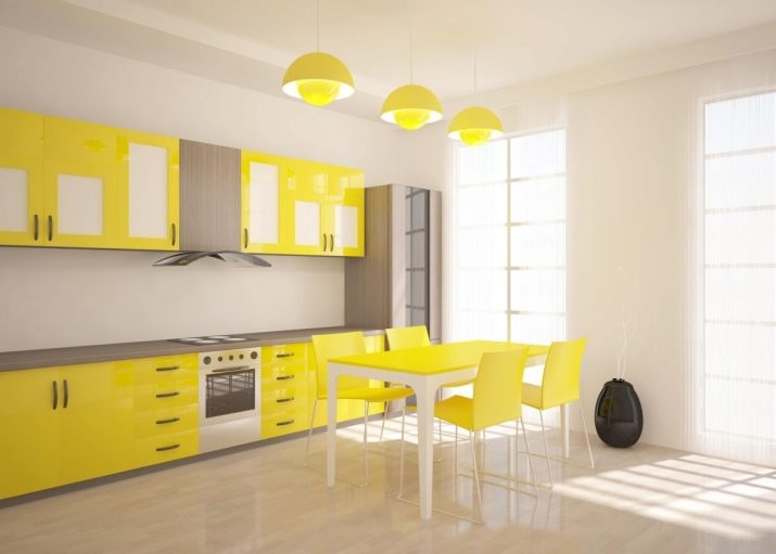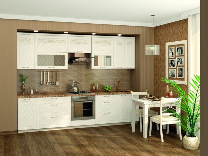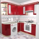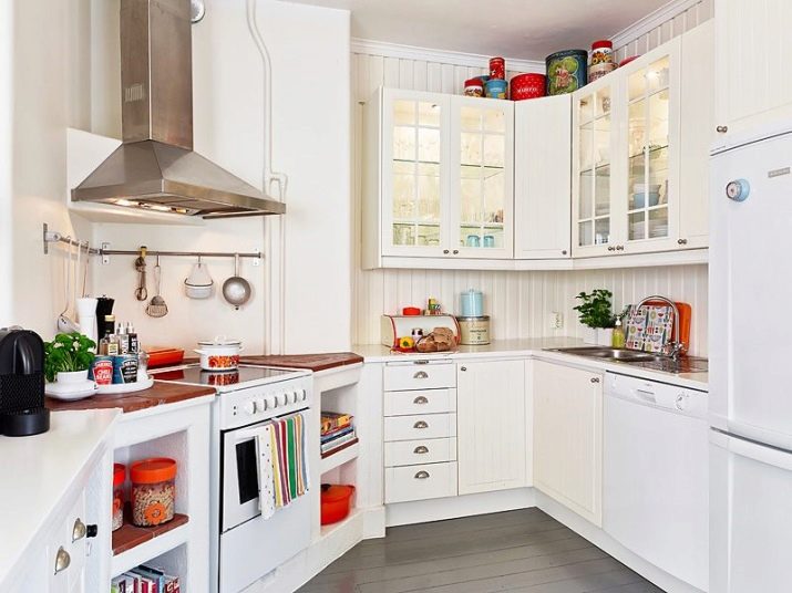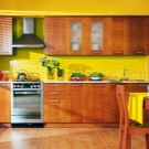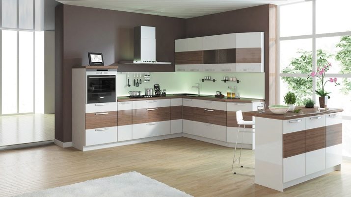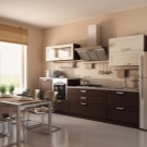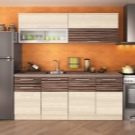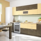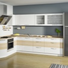 Но в същото време визуално тези мебели изяждат място. За да се изглади този ефект, е необходимо да се избере оптималната комбинация от цветове и довършителни материали. Например, използвайте леки и едноцветни керамични плочки за облицоване на стените на стая или престилка. Отразявайки осветлението, този довършителен материал ще направи кухнята по -просторна..