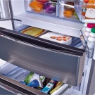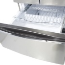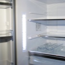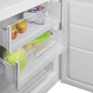 - Вътрешното обзавеждане на хладилното отделение включва 5 стъклени рафта и 4 компактни рафта за врати. Отделението за фризер от своя страна е оборудвано с пет рафта и едно чекмедже.