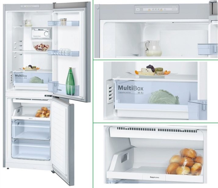 - "Мултибокс". Инсталиран от вътрешната страна на вратите на отделението за охлаждане и съхранение. Състои се от няколко различни контейнера за съхранение на яйца, масло и други хранителни запаси. Позволява ви да поставите всичко с максимална компактност и удобство. Освен това всички тези контейнери са лесни за сваляне и могат да се поставят на масата и да се използват вместо специализирани ястия (например като омазняване).