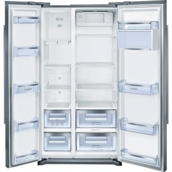 - Модел с две врати Bosch Serie | 4 KAN90VI20R. Това е елитен модел с един компресор с ниво на шуба от 44 dB. Размери-177-91-72 см. С общ обем от 622 литра, той има 200 литрова камера за замразяване, разположена отстрани. Размразяване по система "Без замръзване" автоматичен. Клас А +. Осветлението също е LED, а способността за замразяване на храната достига 12 кг на ден.