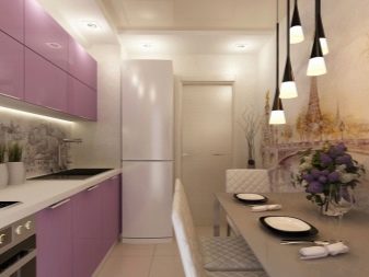 Стенописите могат да се използват и в кухнята. Избирането на престилка за тях може да бъде трудно. Най -лесният начин е да изберете престилка, която да съответства на основния цвят на фототапета. Тази опция е добра за голяма кухня или студио апартамент, в който кухнята е комбинирана с хола. Така че, ако вашата кухня е украсена със фотоапарати с някакъв морски пейзаж, тогава престилката може да бъде направена в “морски” цветове: синьо, синьо, бяло.