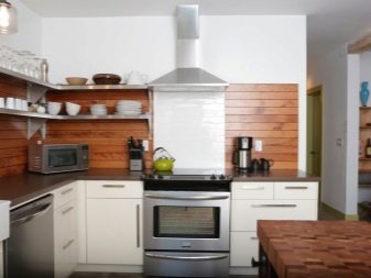 Престилка от естествено дърво в кухнята ще бъде много непрактична. Следователно можете да използвате покрития в стил дърво. Такава престилка ще изглежда като дървена, като в същото време се състои от панели или дъски, покрити със стъкло. Плътна бяла кухня с престилка ще изглежда грандиозно "под дървото". Престилки, състоящи се от панели с различни нюанси на дърво, от по -тъмни до много светли, изглеждат необичайно.