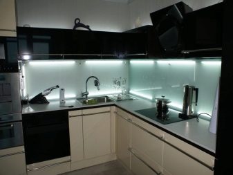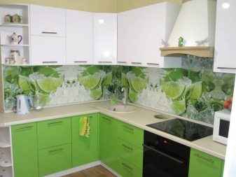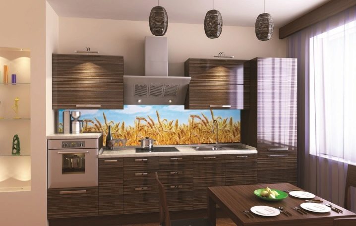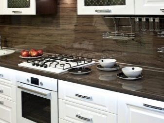 Кухненският гръб трябва да покрива повърхността на стената над работната зона. Обикновено височината му е 60 сантиметра. Въпреки това, в допълнение към стандартните размери, можете да изберете други, които отговарят на характеристиките на вашата кухня. Така че, ако имате високи тавани, тогава можете да вземете по -широки престилки. А за ъглови слушалки изберете по -малка престилка, която да се вписва добре в пространството между шкафовете..