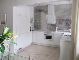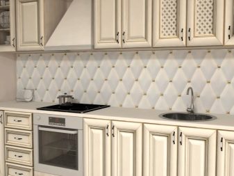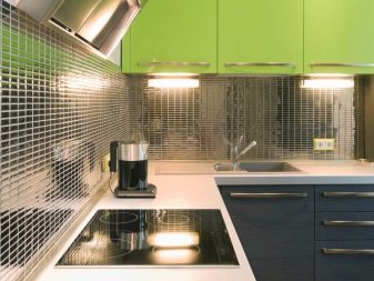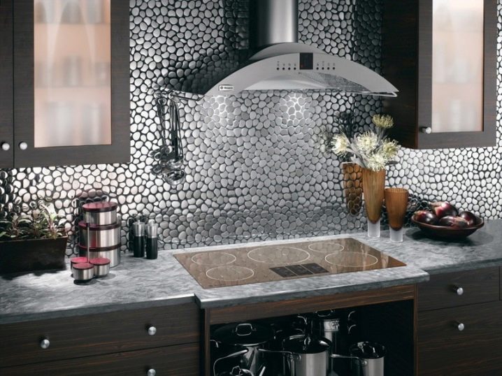 Друг интересен вариант е металната мозайка. Моделът, сглобен от малки метални части, изглежда оригинален и необикновен. Най -подходящите опции са престилки, изработени от малки метални части със златист или сребрист оттенък. Такава престилка ще се впише особено добре в таванска, модерна или високотехнологична кухня. Можете да допълвате тази престилка с кухня, изработена в монохромни цветове..
