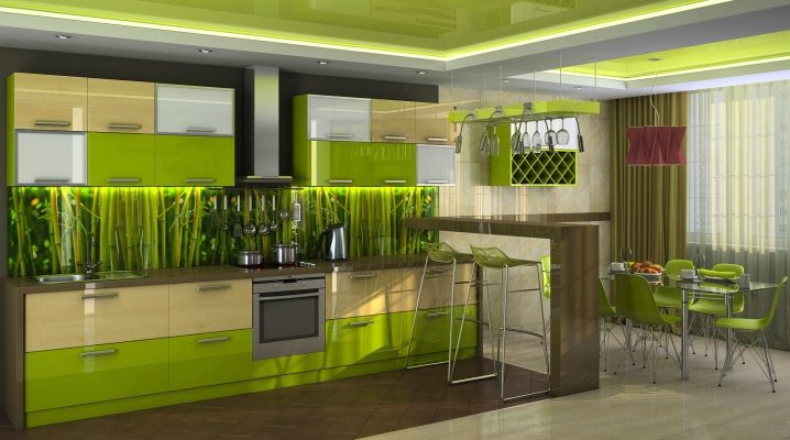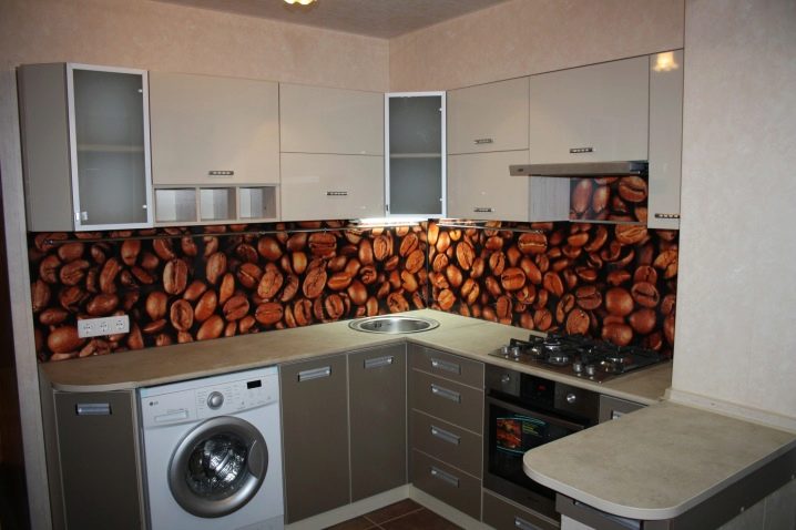 Неутралните и светли цветове помагат визуално да направят стаята по -просторна. За тази цел можете да изберете престилка в бежов, бял или кафеен нюанс. Също така цветът ще ви подхожда "капучино", която изглежда много лека и привлекателна в блясък.