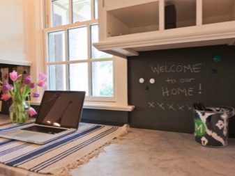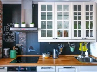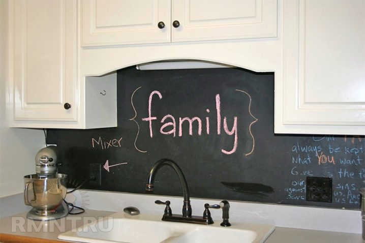 Престилка, стилизирана като черна дъска, също изглежда необичайно в кухнята. Можете да го направите сами. За да направите това, достатъчно е да покриете повърхността на всяка престилка, закупена или поръчана предварително, със специална боя, която просто се използва за създаване на черни дъски. На такава повърхност можете да нарисувате всичко с пастели. Такава престилка е идеална за кухня в апартамент с дете..