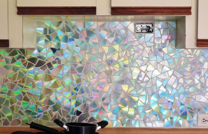 Можете също да опитате да създадете импровизирана мозайка от отломки от дискове. DVD или CD са подходящи за тази цел. Такава повърхност изглежда почти като скъпа престилка от метална мозайка. Освен това ще струва само стотинки. За да създадете такава престилка, просто трябва да изрежете стари дискове на парчета и да ги подредите в произволен ред..