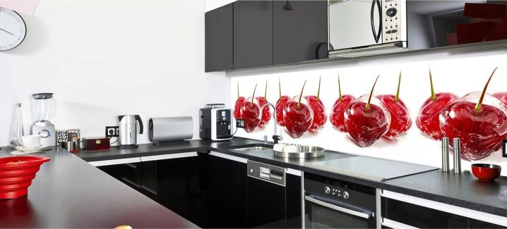 Възможно е и с изображение на храна на престилката. Най -често това са плодове във вода, на маса или в чиния. Ярките лайм, банани, портокали и череши ще добавят колоритен акцент към интериора на вашата кухня. А сдържаните картини, изобразяващи грозде и вино, ще допълнят кухнята в стил Прованс.