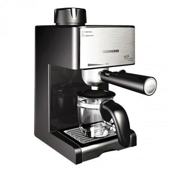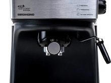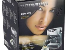 - Модел Redmond RCM-1502 е бюджетен вариант за кафемашина. Представен е под формата на полуавтоматичен модел от роговия тип. Този модел работи само със смляно кафе, тъй като няма кафемелачка. В същото време има широк списък с напитки за приготвяне: от еспресо до капучино. Работното налягане е четири бара, което е значително по-малко, отколкото например в модела Redmond RCM-1503.