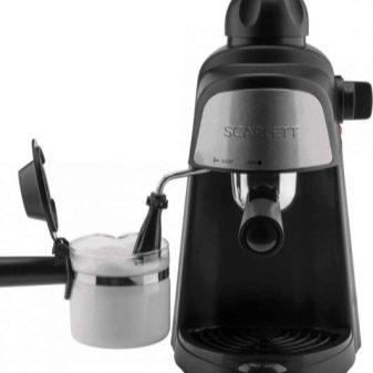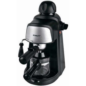 - Кафемашина тип рожков Scarlett SC-037. Ярък представител на съотношението цена-качество. На бюджетна цена можете да получите наистина добра машина. Производител Китай. Невероятно компактен, в същото време има налягане от 4 бара. Приготвя експресо и капучино. Комплектът включва рог, в който трябва да натъпчете смляното кафе. Има специална ръчна пенообразувател. Можете да направите 2 напитки само за 10 минути. Включва контейнери за събиране на експресо.
