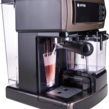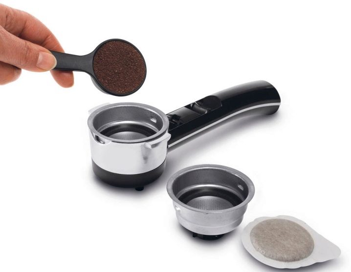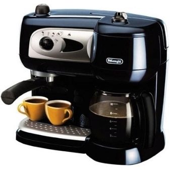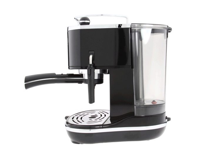 От конструктивните характеристики на устройството бих искал да отбележа, че са предвидени отделни отделения за вода и за смилани суровини. Течността се излива в долната, а прахът се излива в горната. Готовата напитка се оформя в отделен контейнер. Ако говорим за количеството на готовата напитка, тогава помпените машини могат да приготвят по -голям обем кафе от пара.