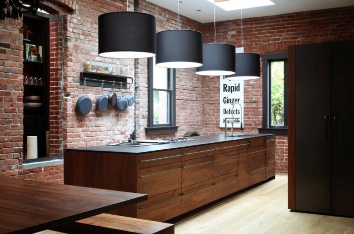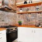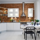 Когато правите декорации от тухли, не трябва да сте ревностни и да придадете на кухнята вид на мазе – един елемент ще бъде достатъчен. Тухлена камина или бар брояч ще изглеждат страхотно. И само стена с изпъкнали тухли ще създаде прекрасен образ. По желание може да бъде украсена с декоративни стенни елементи. Например, декоративните рафтове за ястия на тухлен фон ще създадат уникален вкус и ще се превърнат в ярък акцент в интериора..